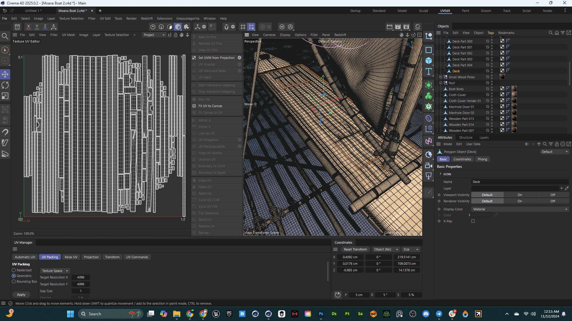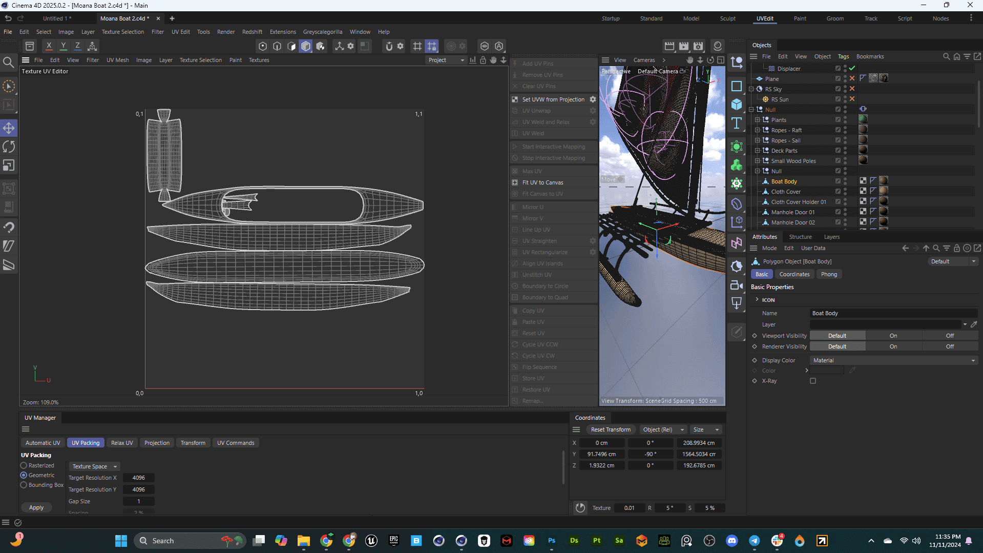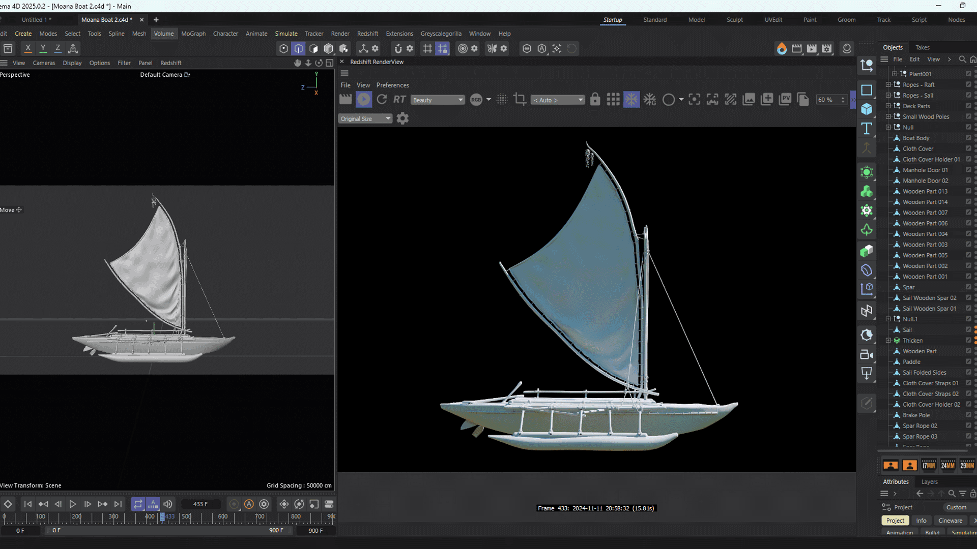The initial boat model was developed by Ahmed Ziab, focusing on an authentic Polynesian design with intricate wooden elements, ropes, and a signature sail. Ahmed’s work on this model ensured accurate topology and well-structured geometry, essential for adding complex textures and animations later in the process.