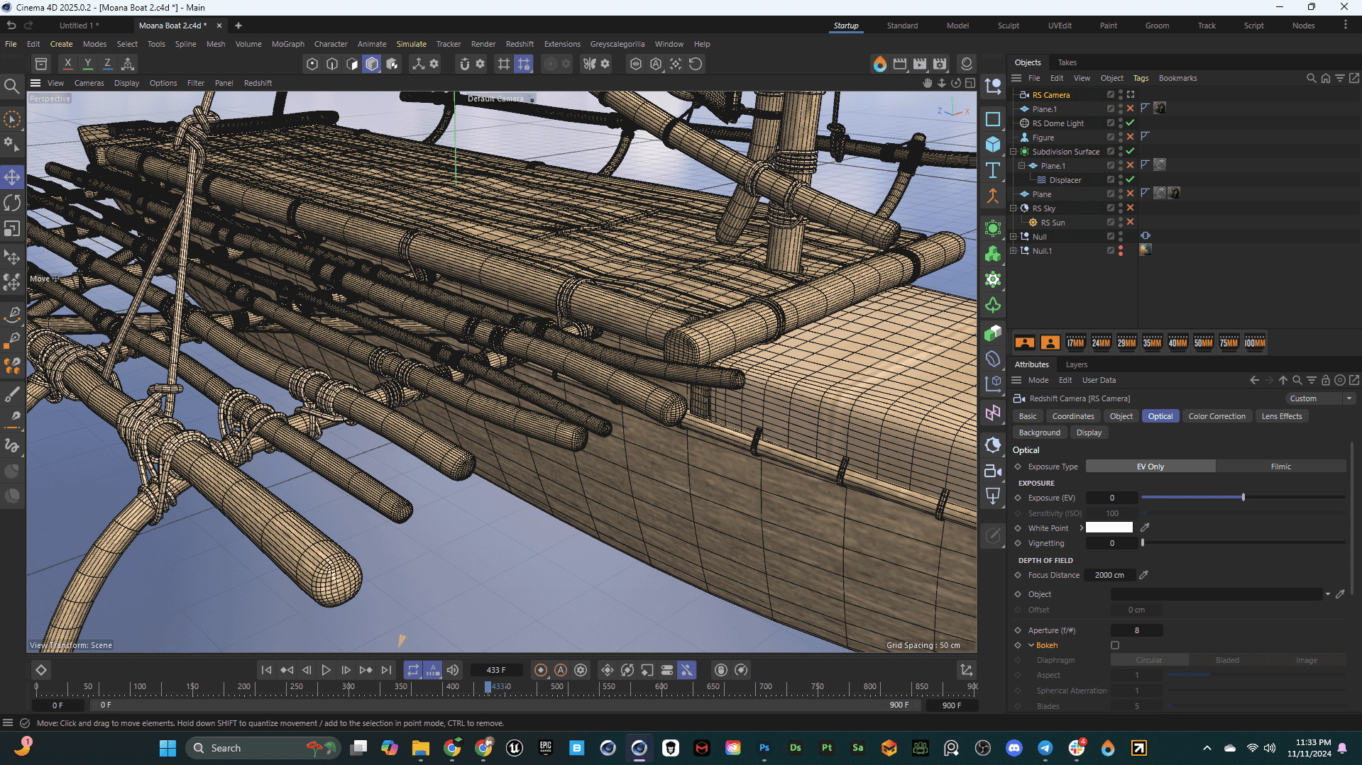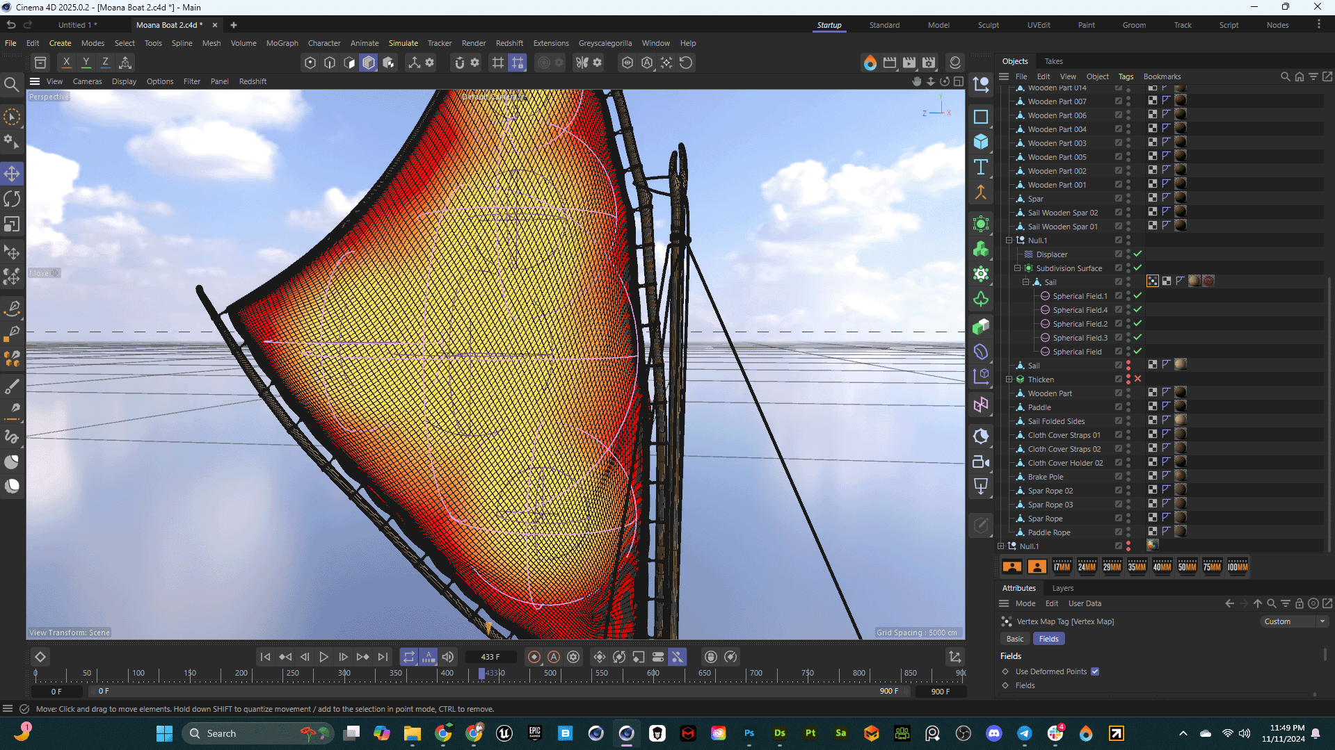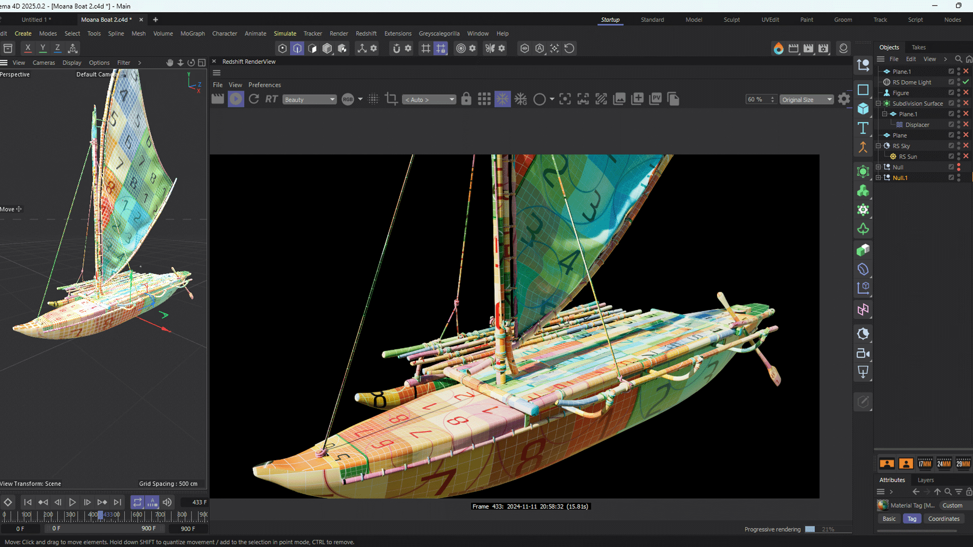 The initial boat model was developed by Ahmed Ziab, focusing on an authentic Polynesian design with intricate wooden elements, ropes, and a signature sail. Ahmed’s work on this model ensured accurate topology and well-structured geometry, essential for adding complex textures and animations later in the process.