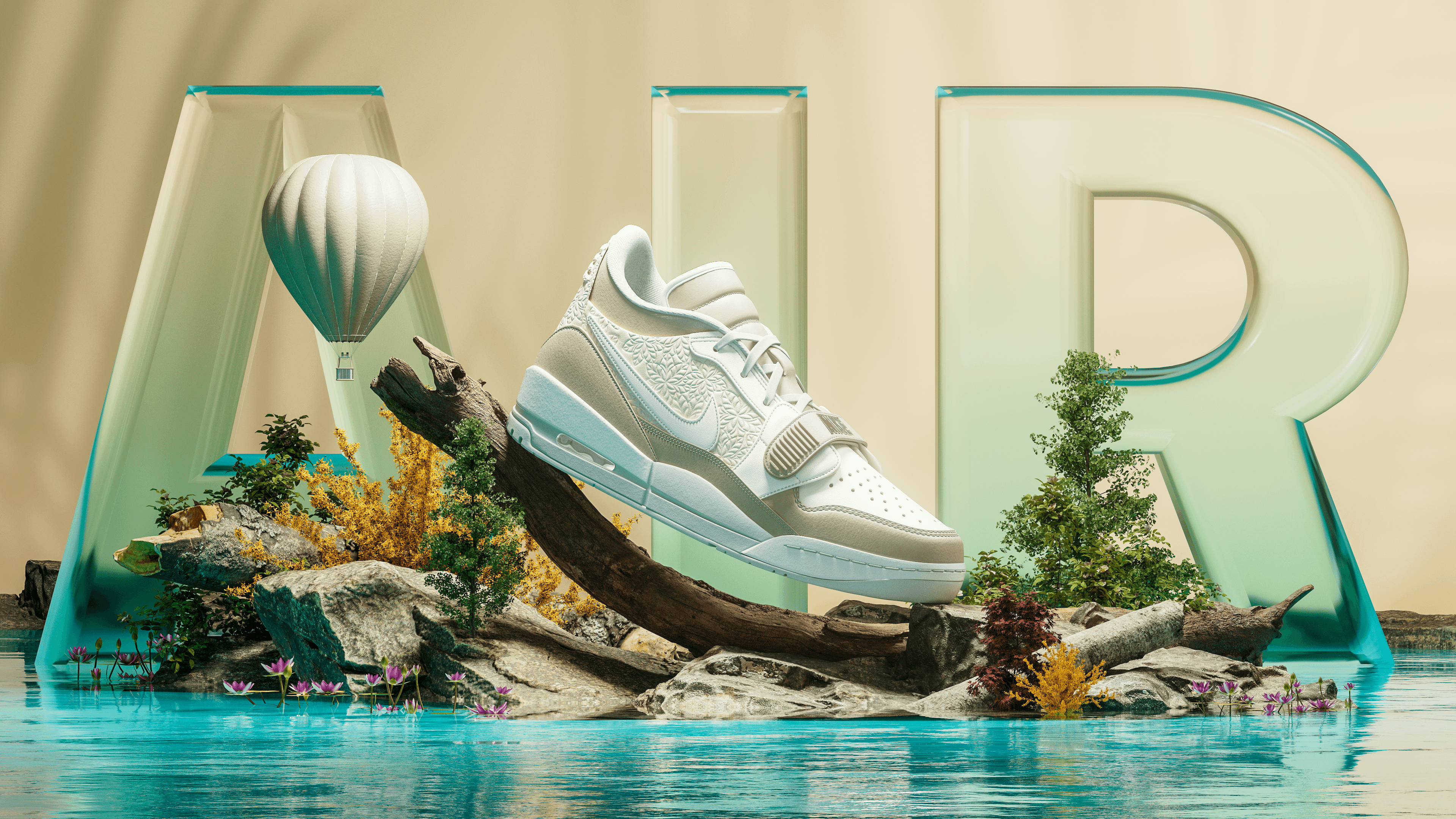 The shoe acts as the focal point, suspended and balanced rather than grounded. Around it, the environment suggests growth, water, air, and elevation. The composition is intentionally quiet, letting scale, texture, and negative space do the heavy lifting.