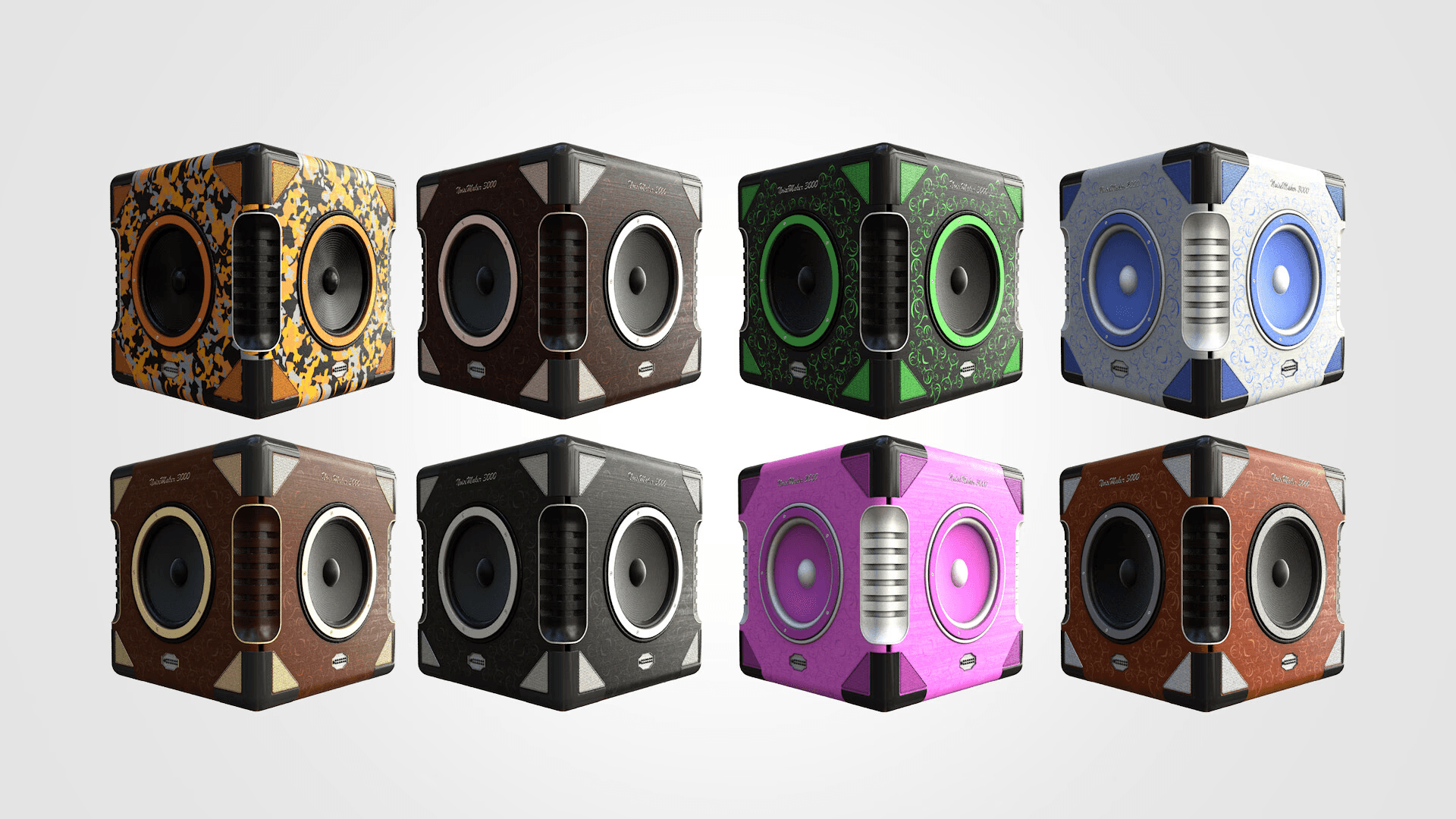 Dynamic Speaker Designs: Includes customizable speaker patterns, with options to adjust ring details, grill structures, and metallic accents.